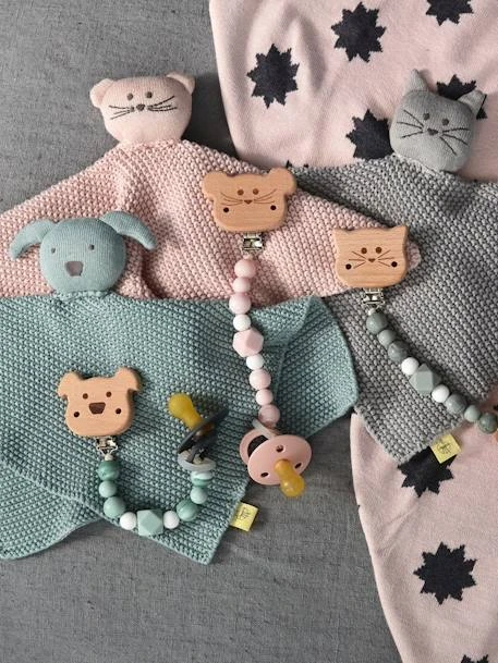 Indispensable, hygiénique et pratique, l’attache-sucette Little Chums se pince sur le vêtement de bébé pour éviter qu’elle ne tombe par terre et ne s’égare. Bébé peut facilement attraper sa petite chaîne boules pour récupérer sa tétine et il va adorer sa mignonne petite tête en bois représentant un joli motif chien, chat ou souris.